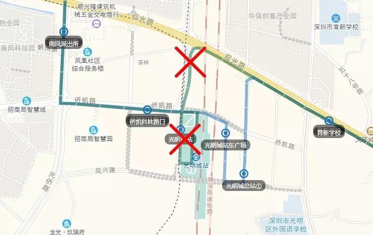 双方向取消“光明城站”1对公交停靠站,增加“光明城站东广场”1对公交停靠站。