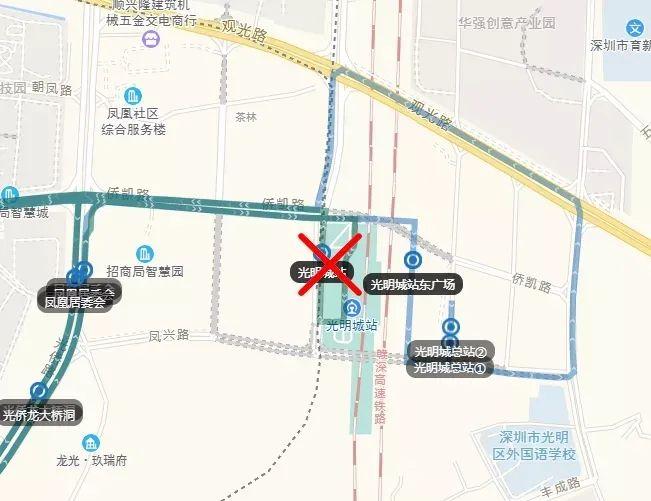 取消“光明城站”1对公交停靠站,增加“光明城站东广场”1对公交停靠站及“光明城总站①(南侧)、光明城总站②(北侧)”等2个单边公交停靠站。