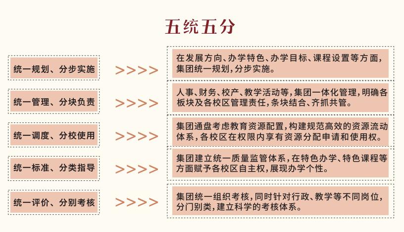 宝中集团成功构建“一体化条块管理模式”,对新加盟校区实施统一规划(集团顶层设计发展方向和办学特色)、统一管理(集团一体化管理)、统一教研(教学资源共享,统一进行大备课组教研活动,与集团初中部保持同步)、统一调配(管理骨干、师资调整适当向新加盟校区倾斜)、统一培训(名师引领,共享共赢),使新加盟学校的内外管理、质量要求、育人标准与宝安中学本部一脉相承,同时培育各分校的特色教育、特色管理,充分释放办学活力。