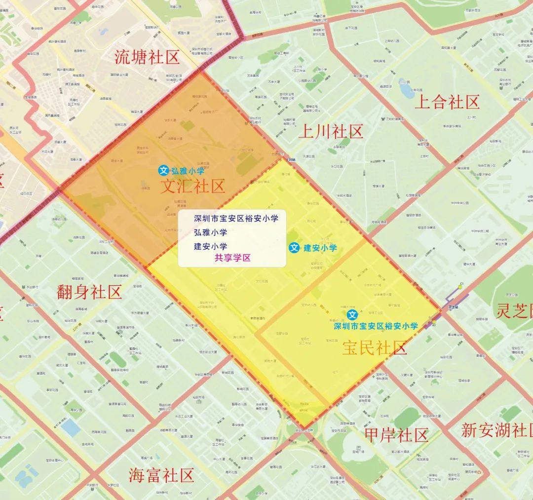 学区划分:深圳市宝安区裕安小学与弘雅小学、建安小学组成共享学区,不再分享文汇学校(小学部)学位。
