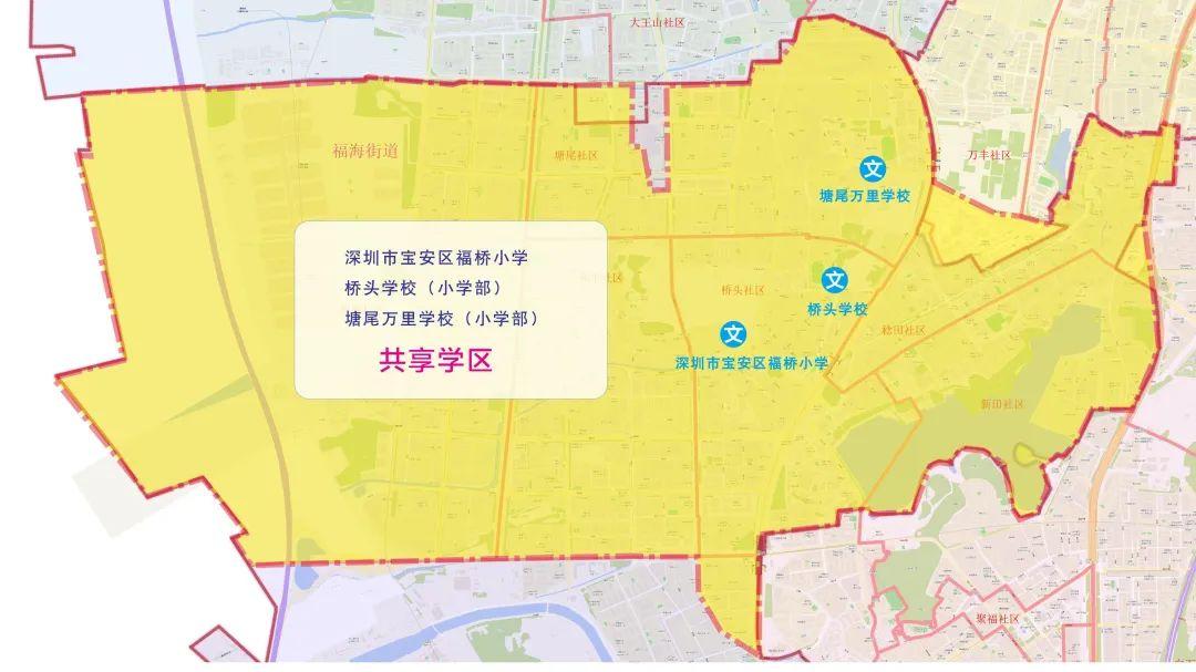 学区划分:深圳市宝安区福桥小学与桥头学校(小学部)、塘尾万里学校(小学部)组成共享学区。