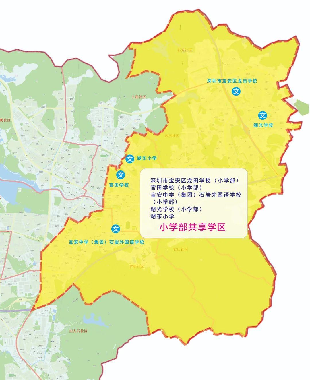学区划分:深圳市宝安区龙田学校(小学部)与官田学校(小学部)、宝安中学(集团)石岩外国语学校(小学部)、湖光学校(小学部)、湖东小学组成共享学区分享;深圳市宝安区龙田学校(初中部)与宝安中学(集团)石岩外国语学校(初中部)、官田学校(初中部)、湖光学校(初中部)组成共享学区。