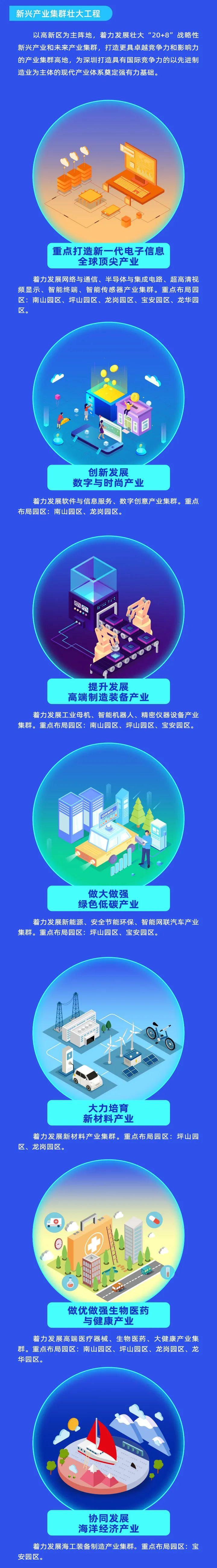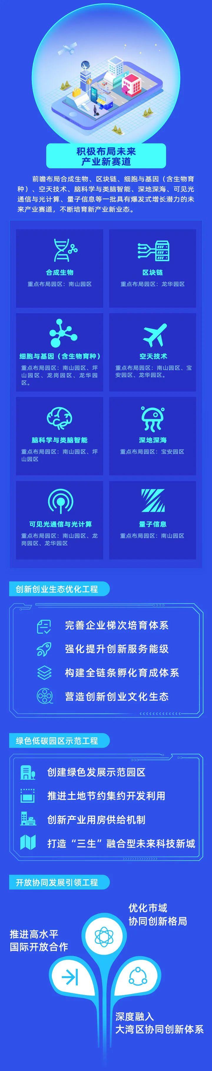 《规划》重点部署了“自主创新能级跃升工程”“新兴产业集群壮大工程”“创新创业生态优化工程”“绿色低碳园区示范工程”“开放协同发展引领工程”等五大工程。其中,“新兴产业集群壮大工程”提出以高新区为主阵地,着力发展壮大“20+8”战略性新兴产业和未来产业集群,打造更具卓越竞争力和影响力的产业集群高地,为深圳打造具有国际竞争力、以先进制造业为主体的现代产业体系奠定强有力基础。