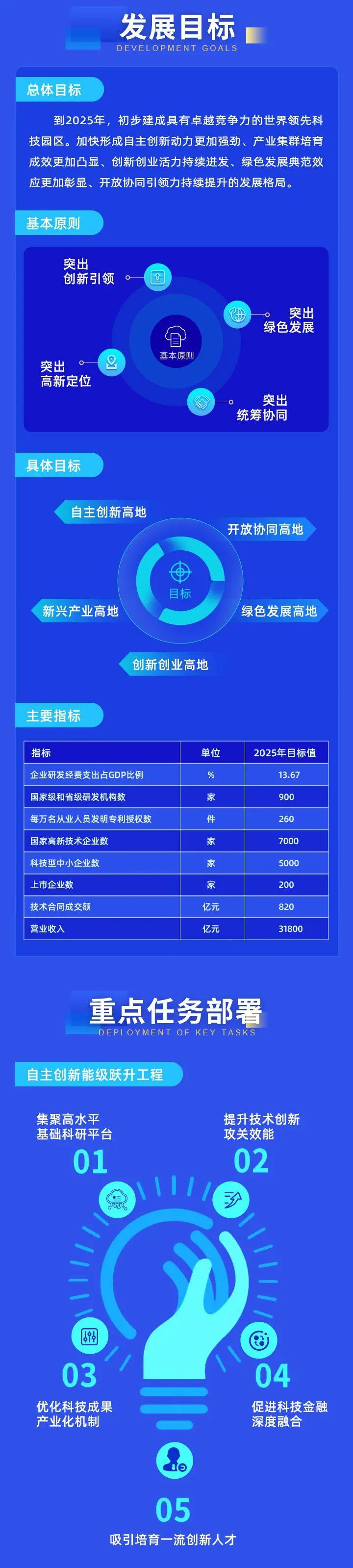 《规划》设置了深圳国家高新区2025年的主要目标值,包括企业研发经费支出占GDP比例为13.67%,国家级和省级研发机构数为900家,每万名从业人员发明专利授权数为260件,国家高新技术企业为7000家,科技型中小企业数为5000家,上市企业数为200家,技术合同成交额820亿元,营业收入31800亿元。