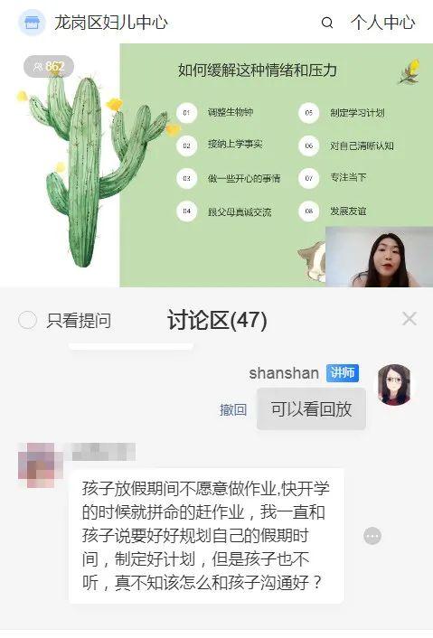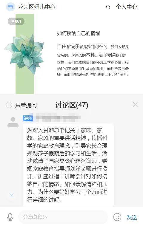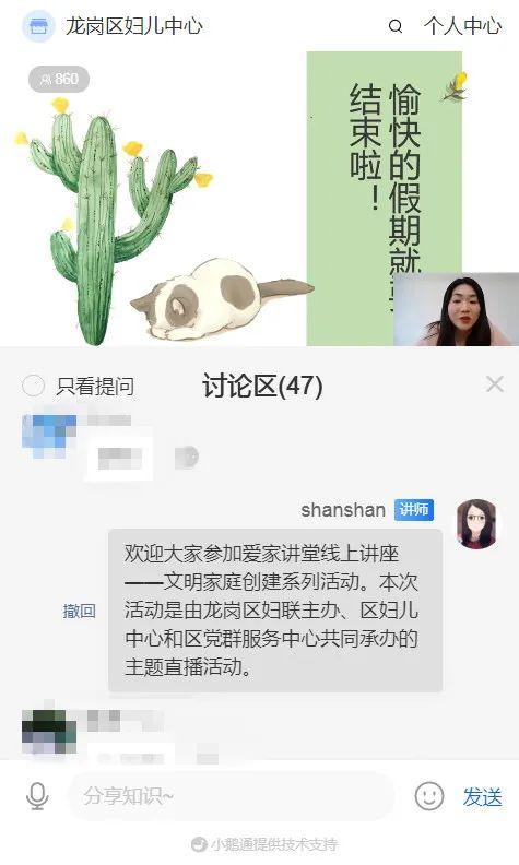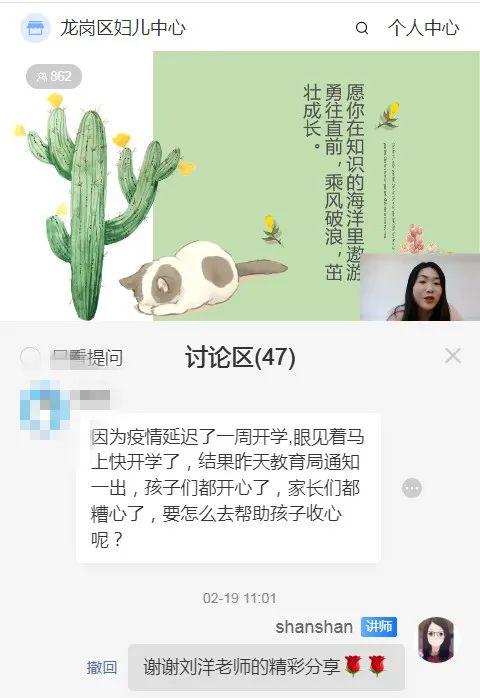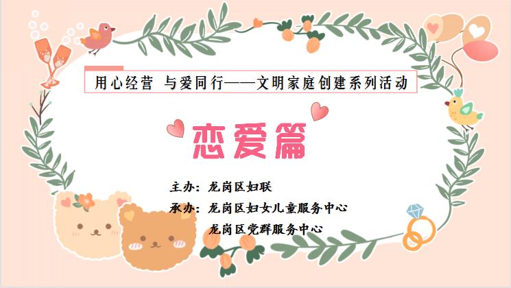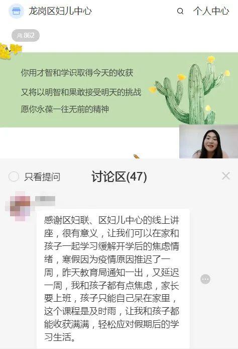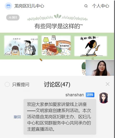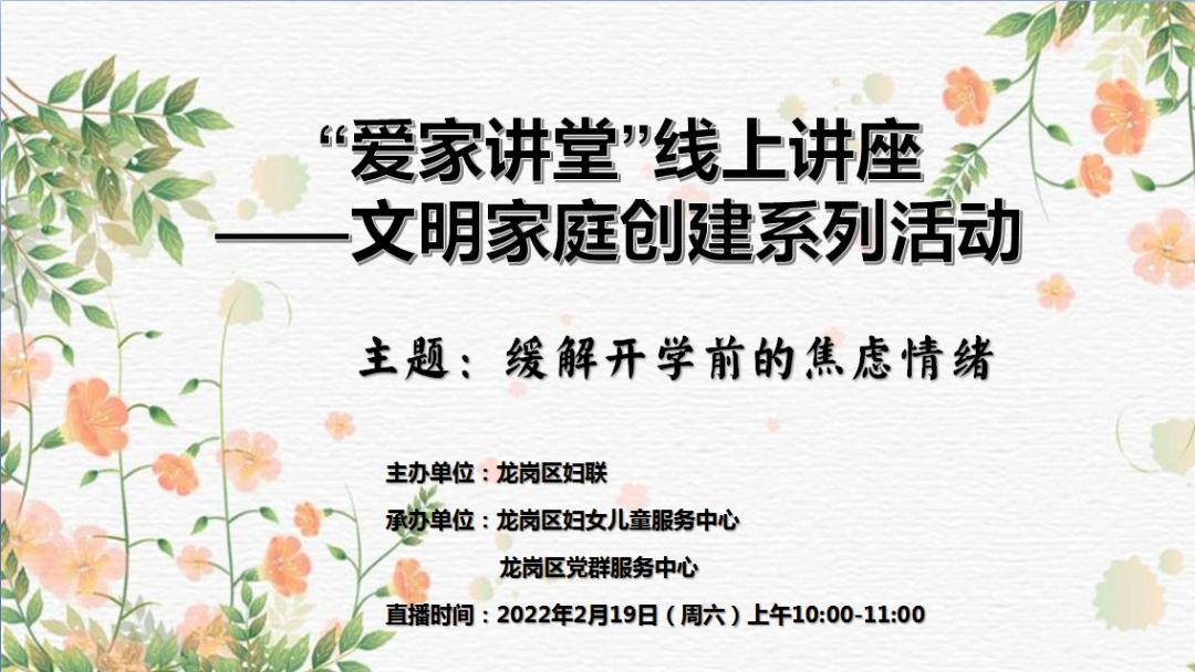 2月18日、19日,龙岗区妇儿中心开展了以“用心经营 与爱同行”和“缓解开学前的焦虑情绪”为主题的文明家庭创建系列活动,通过线上讲座的形式,教授辖区居民朋友学习良好的情感建立技巧,缓解学生家长开学前焦虑,助力文明家庭创建。