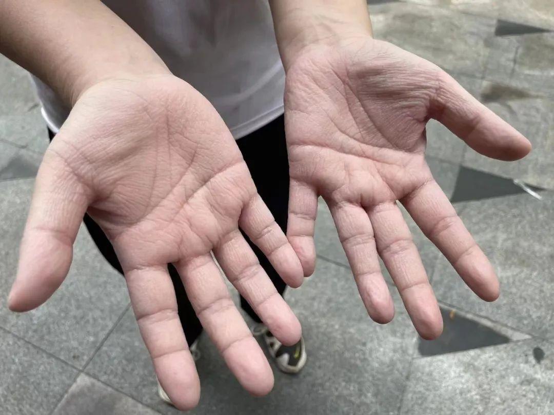 来生理期时,整个人裹在防护服里,像蒸笼上的包子。整套衣服脱下来非常麻烦,穿上后想上厕所,就得忍。每天从防护服里出来,被汗泡发的双手全是褶皱,同事打趣:“这纹理太有质感了。”