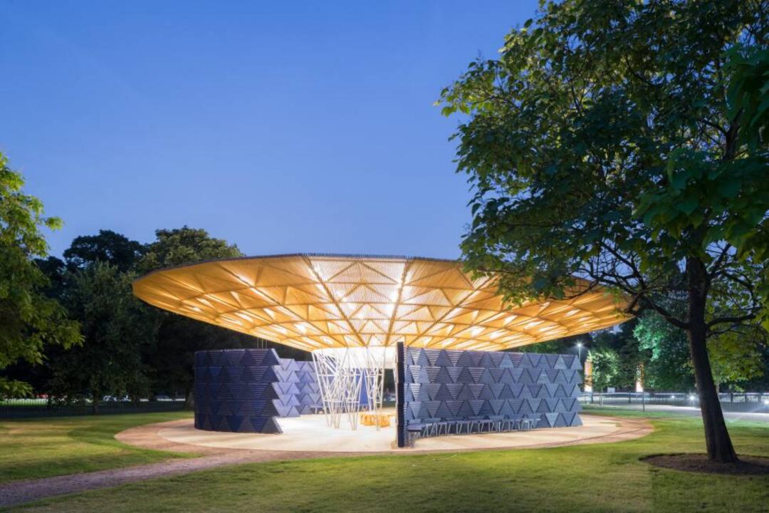 到了晚上,树冠变成了一个光源。墙上的穿孔让人们可以瞥见展馆内部的运动和活动。通过这种方式,凯雷的蛇形画廊变成了一座灯塔,成为叙事和团结的象征。