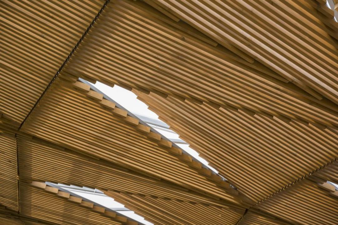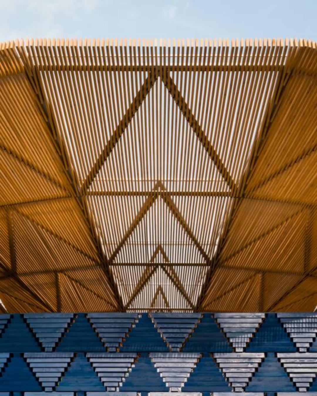 屋顶下方排列着木质遮阳元素,营造出随太阳和云层移动而变化的动态阴影效果。展馆内有趣的光影交错营造了一种充满活力的氛围。