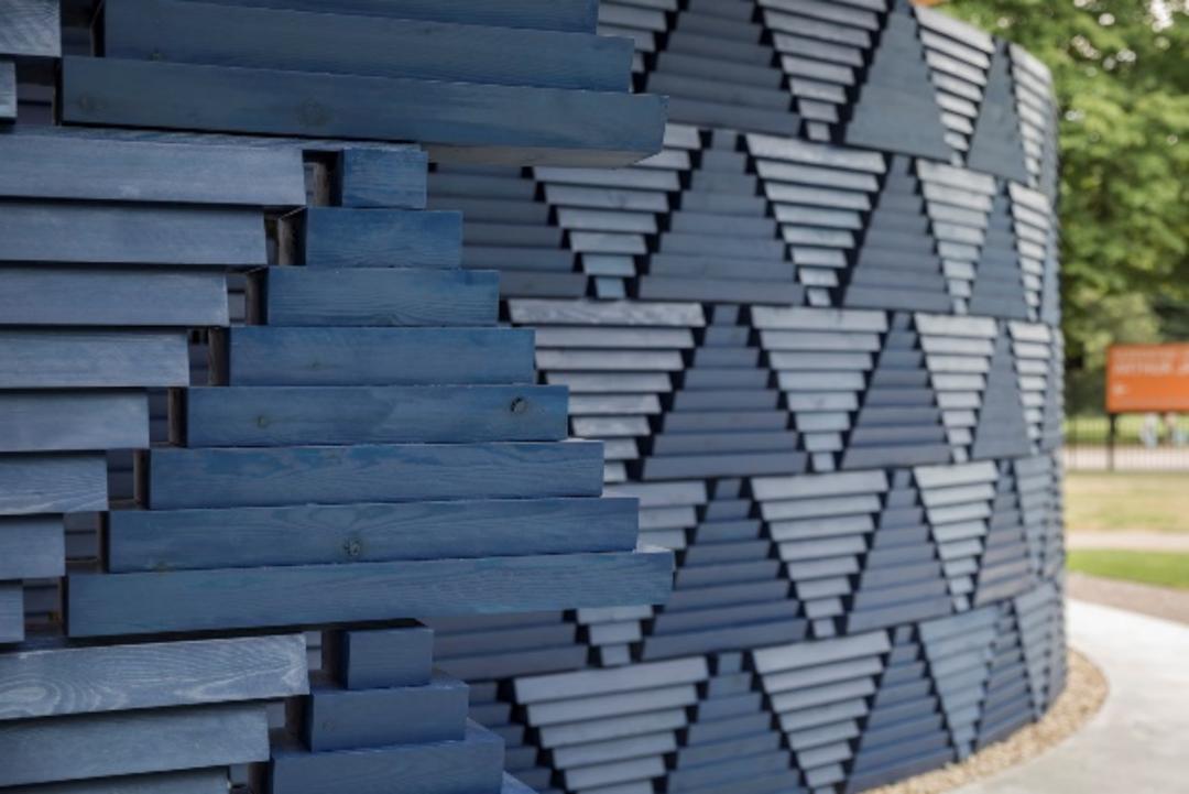 凯雷选择使用木材不仅仅因为它具有可持续性、成本低、可以在本地获取,还因为可以以许多不同的方式对它进行切割、组装和再成型。通过调整木材切割的角度,我们可以为展馆的外墙增添不同的纹理样式,让墙的表面看起来颜色深浅不一,阴影各不相同,更加有趣,就像纺织品的图案一样。