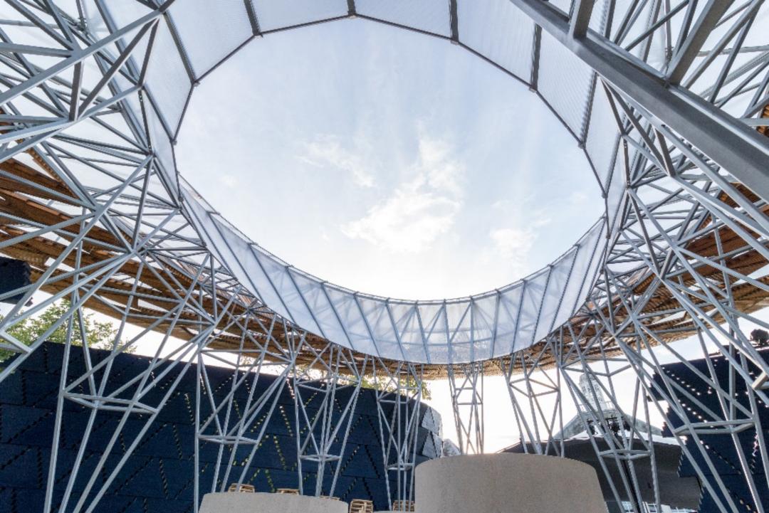 展馆的遮篷由一个中央钢结构支撑,十分开阔,形状类似树冠,在遮挡降雨、隔绝暑气的同时,又可以让空气自由流通。墙壁是由三角形的木头组成的,形成了V字形的图案。用木条装饰的屋顶上有同样的三角形图案,有些镶板向上展开,允许光线进入展馆。到了晚上,墙面成了光源,墙上的小穿孔随着展馆内的运动和活动而不断闪烁。