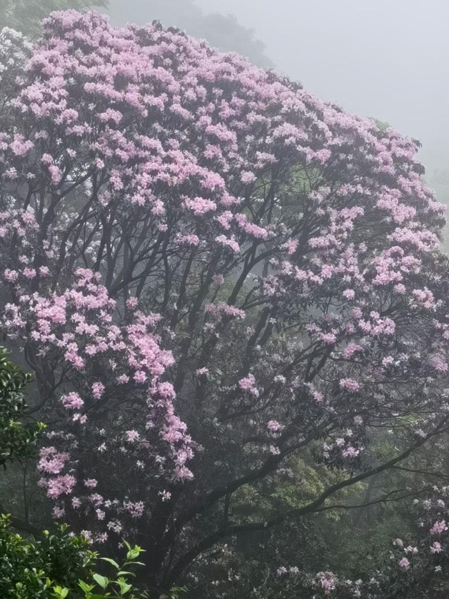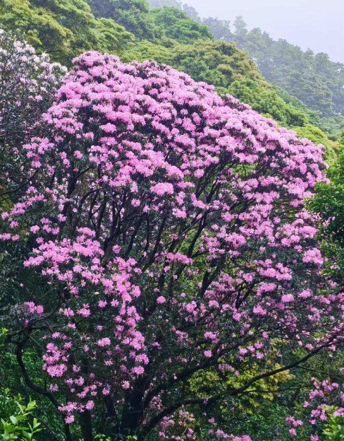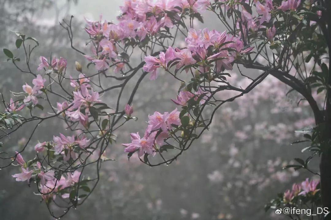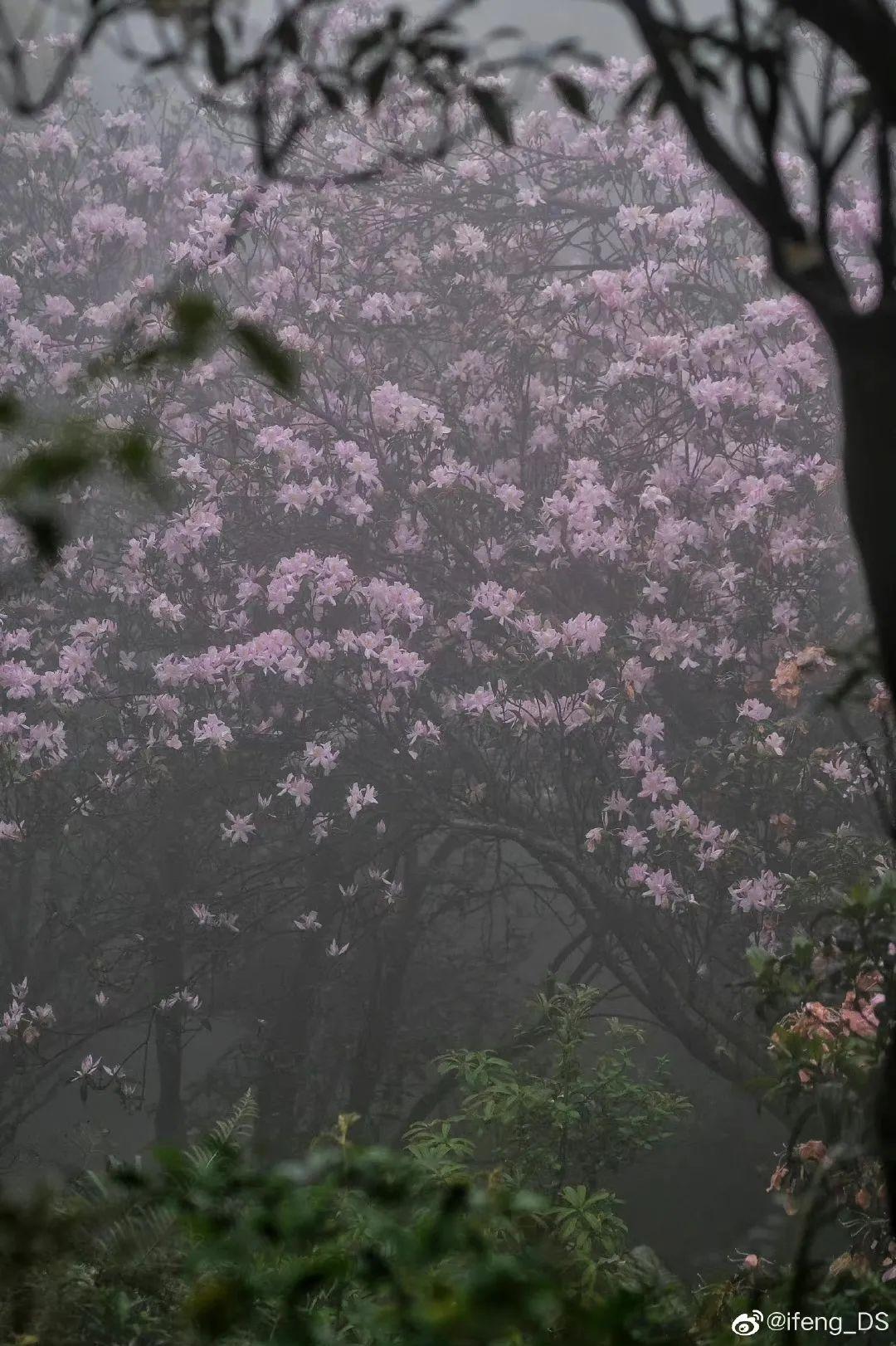 掩着朦胧的水雾,毛棉杜鹃在翠绿山谷中铺陈伸展,悄无声息又绚丽无比。