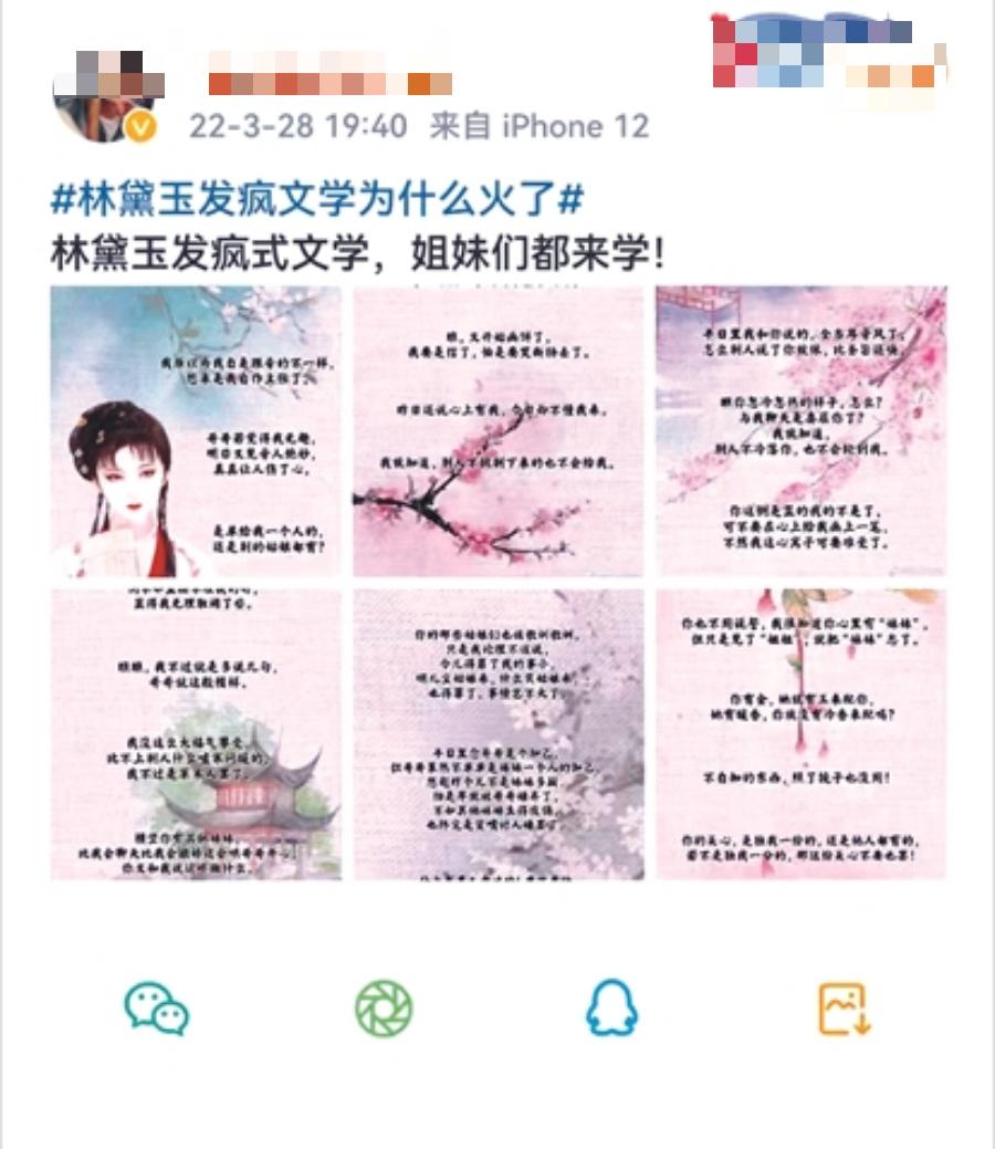 最近,“林黛玉发疯文学”在网络走红。网友们脑洞大开,将1987版电视剧《红楼梦》里林黛玉的“怼人”话术巧妙应用到各类生活场景中,其中职场话题是“林学”的创作热点,他们结合当下一些年轻人学历内卷、职场躺平的心态,对剧中台词进行了二次创作,制作语录海报,引发更多网友们的创作与模仿欲望。