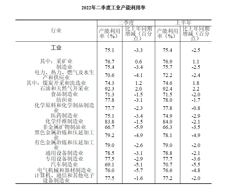 分主要行业看,二季度,煤炭开采和洗选业产能利用率为74.3%,食品制造业为71.3%,纺织业为77.8%,化学原料和化学制品制造业为77.7%,非金属矿物制品业为66.7%,黑色金属冶炼和压延加工业为79.2%,有色金属冶炼和压延加工业为79.0%,通用设备制造业为78.5%,专用设备制造业为77.5%,汽车制造业为69.1%,电气机械和器材制造业为76.0%,计算机、通信和其他电子设备制造业为77.5%。