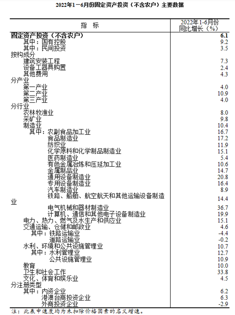 1—6月份,全国固定资产投资(不含农户)271430亿元,同比增长6.1%。其中,民间固定资产投资153074亿元,同比增长3.5%。从环比看,6月份固定资产投资(不含农户)增长0.95%。
