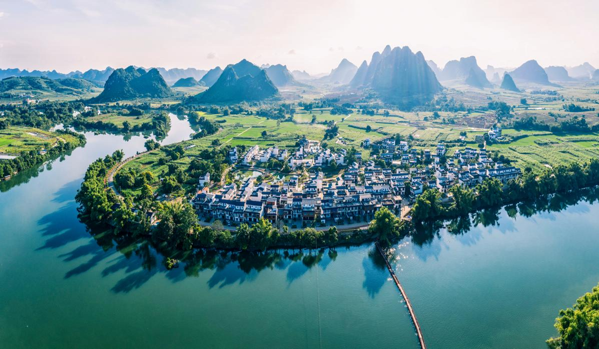 在江州区新和镇黑水河畔,村屯、民宿、田园构成一幅美丽的生态画卷(央广网发江州区委宣传部供图)