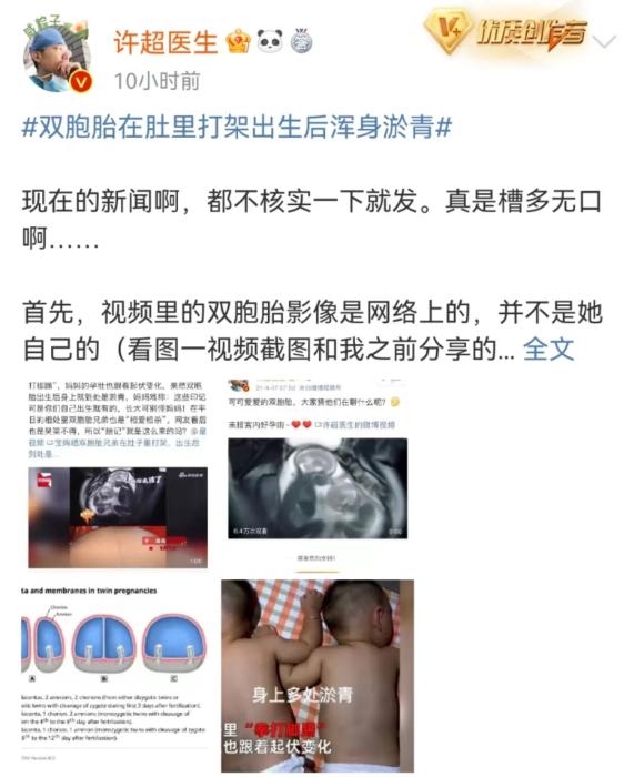微博名为“许超医生”的健康博主也在微博上用“槽多无口”来形容这则消息。他表示,双胞胎在子宫里的动作基本都是无意识的,伸手伸脚并不是在打架,而且隔着羊膜囊又有羊水的缓冲,几乎不会给对方造成“伤害”。