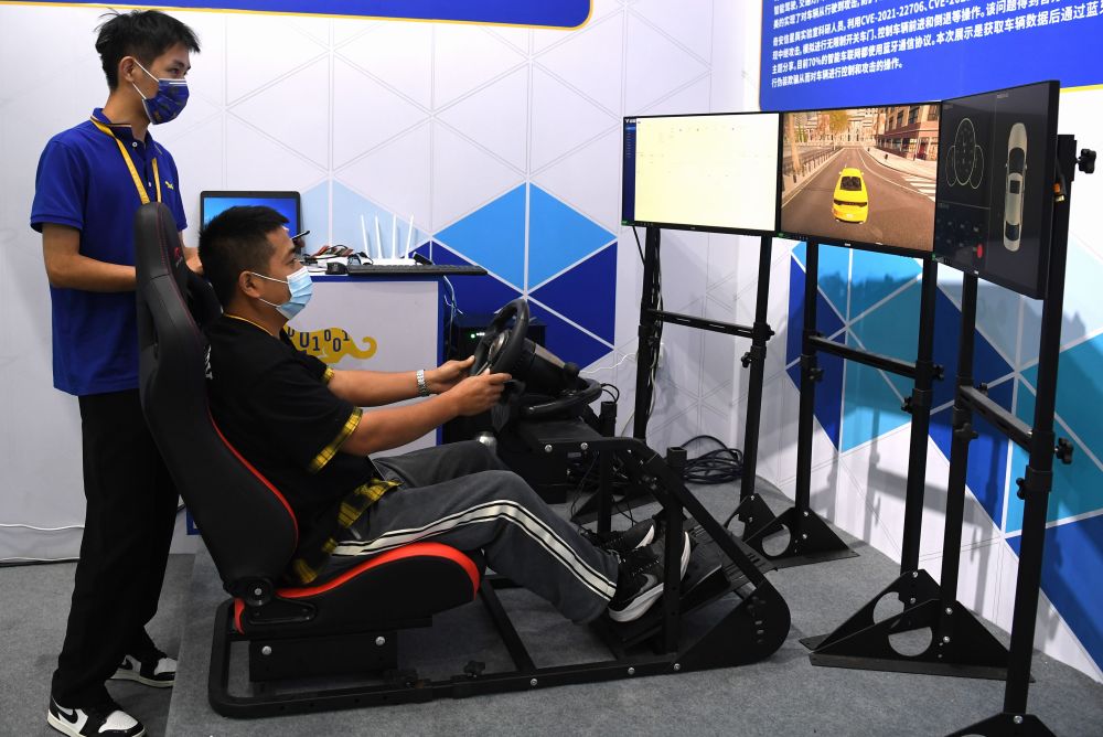 ↑9月4日,一家参展企业代表在演示使用车载网络安全科技产品。