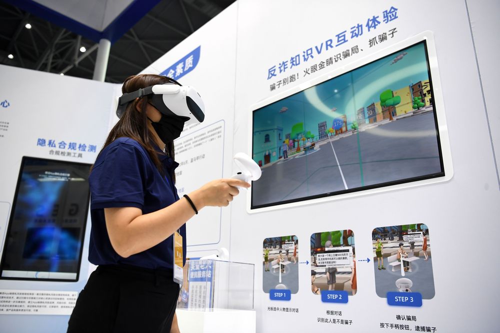 ↑9月4日,一家参展企业代表在演示反诈知识VR互动体验项目。