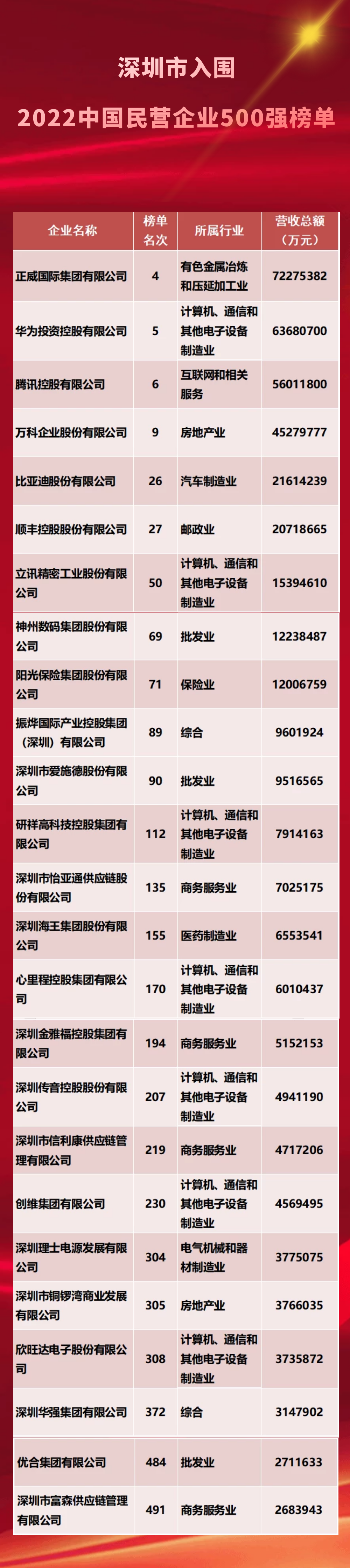 据深圳市工商联统计,这次深圳入围企业的数量及质量仍然占全省首位。广东入围中国民营企业500强51家,其中,深圳占25家,占比49%。正威、华为、腾讯、万科分别排在中国民营企业500强第4、5、6、9位。广东入围中国民营企业制造业500强49家,其中,深圳占22家,占比45%。正威、华为分别排在中国民营制造业企业500强第2、3位。广东入围中国民营企业服务业100强18家,其中,深圳占10家,占比55%。腾讯、万科、顺丰分别排在中国民营服务业企业100强第3、5、10位。