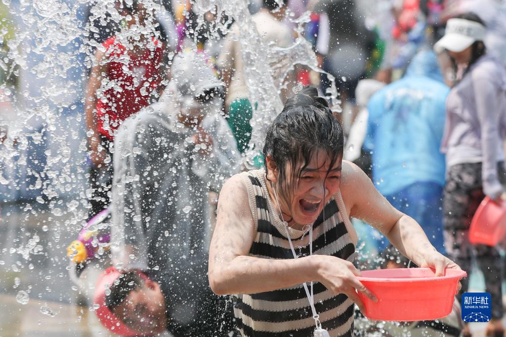 4月15日,人们在云南省西双版纳傣族自治州景洪市泼水广场泼水狂欢。当日,云南省西双版纳傣族自治州举行傣历新年取水仪式及泼水狂欢,数万名各族群众和游客在景洪市用相互泼水的方式互送祝福、传递欢乐。新华社记者 单宇琦 摄