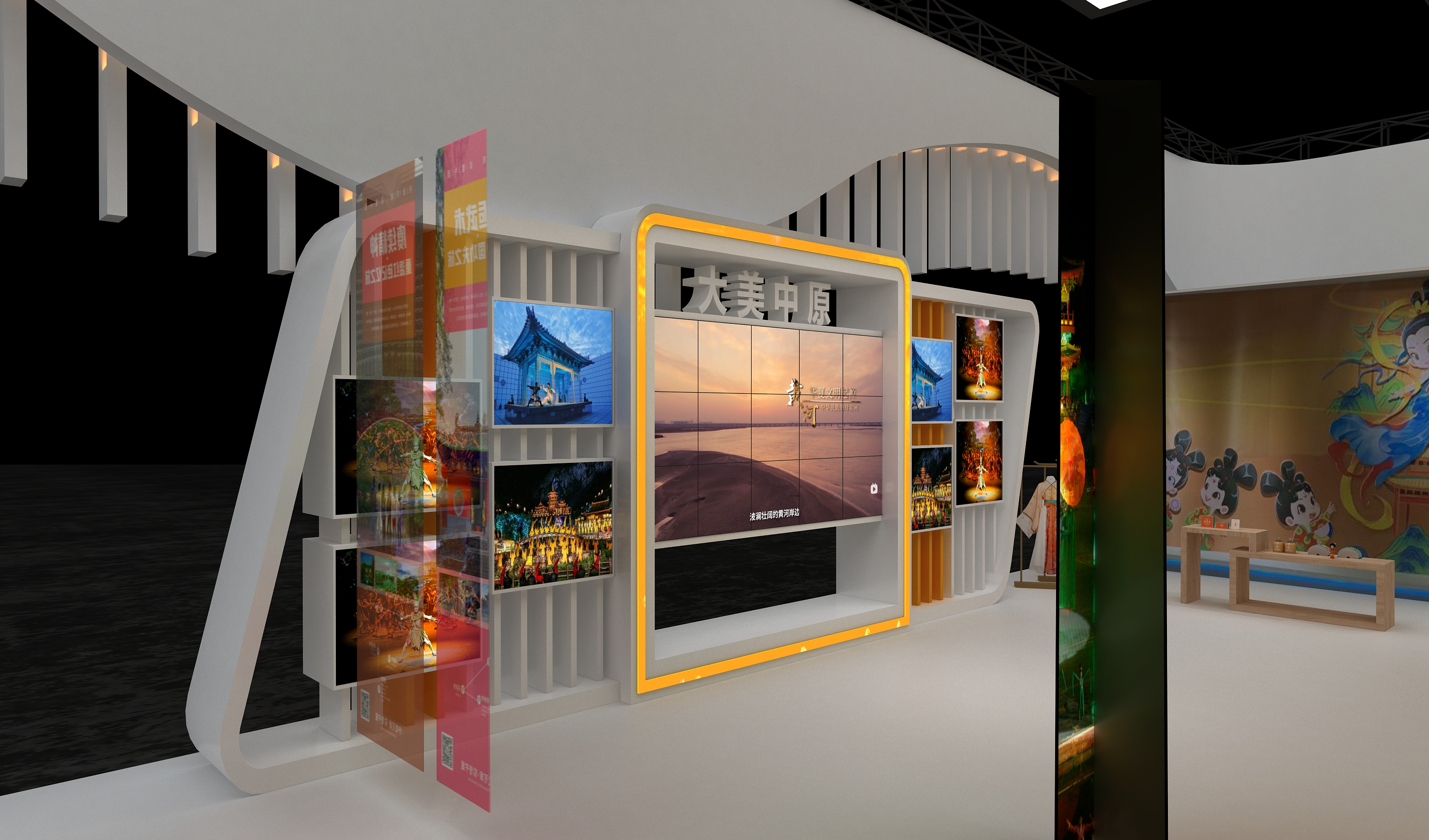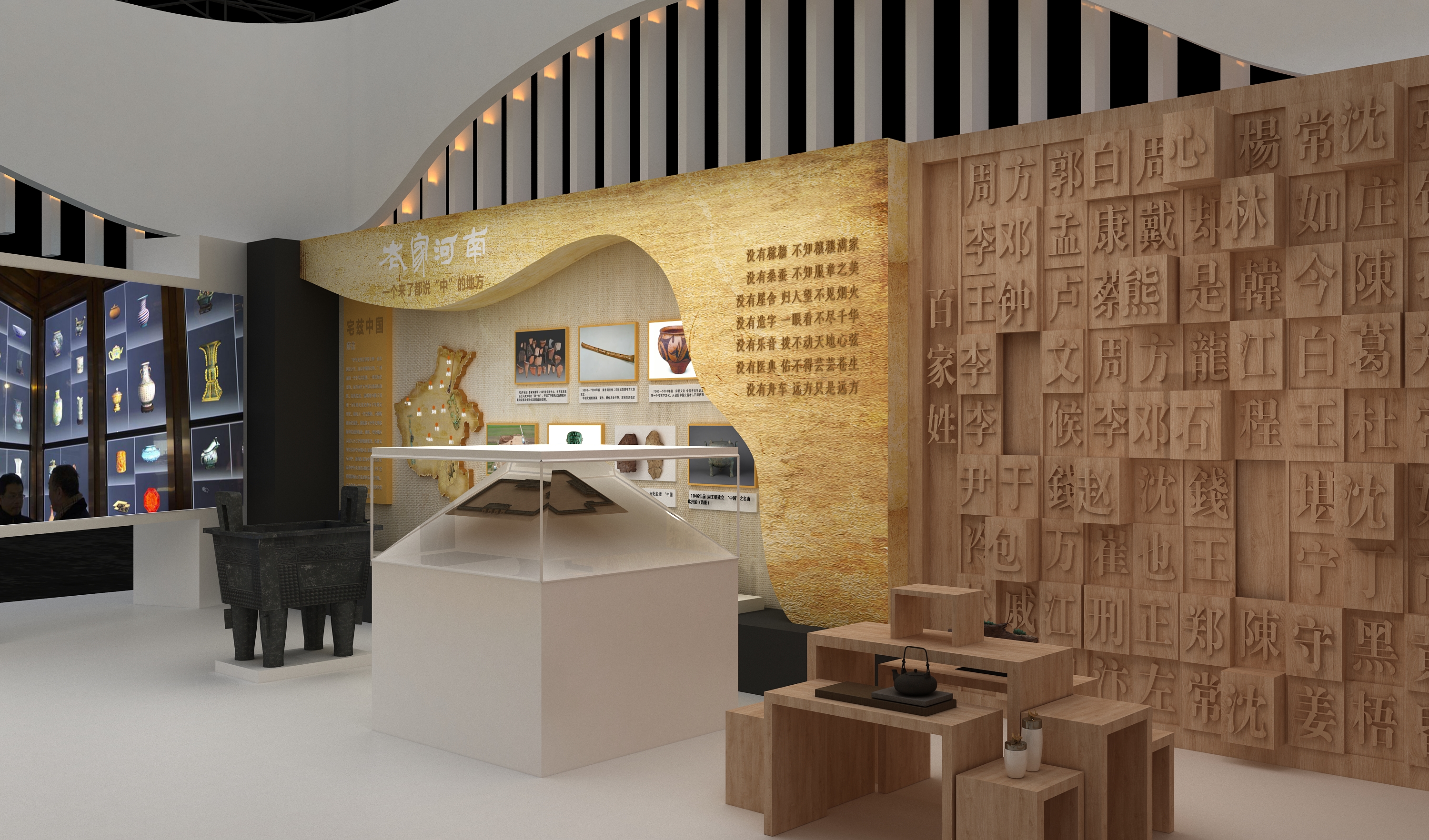 进入河南展区,首先映入眼帘的便是代表河南历史的河南文脉地图主题形象墙,采用的是反映河南厚重历史文化底蕴的夯土墙颜色,传递河南人民对沧桑岁月、祖先文明的敬畏。