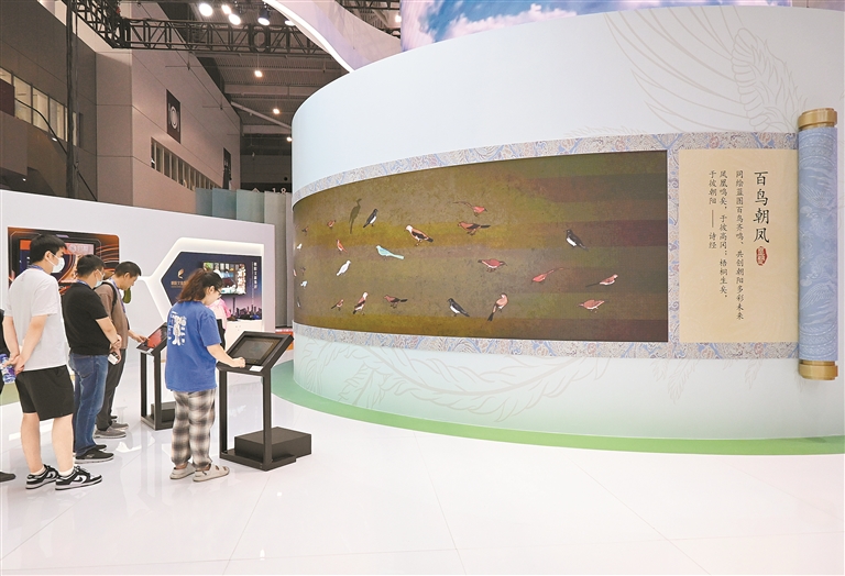 数字交互艺术作品《百鸟朝凤》,由中央美术学院携手北京朝阳区融合共创,观众可通过交互屏幕,将自己绘制的多彩飞鸟融入经典艺术作品当中,沉浸体验穿越千年共创共生的乐趣。深圳特区报记者 耿超逸 摄