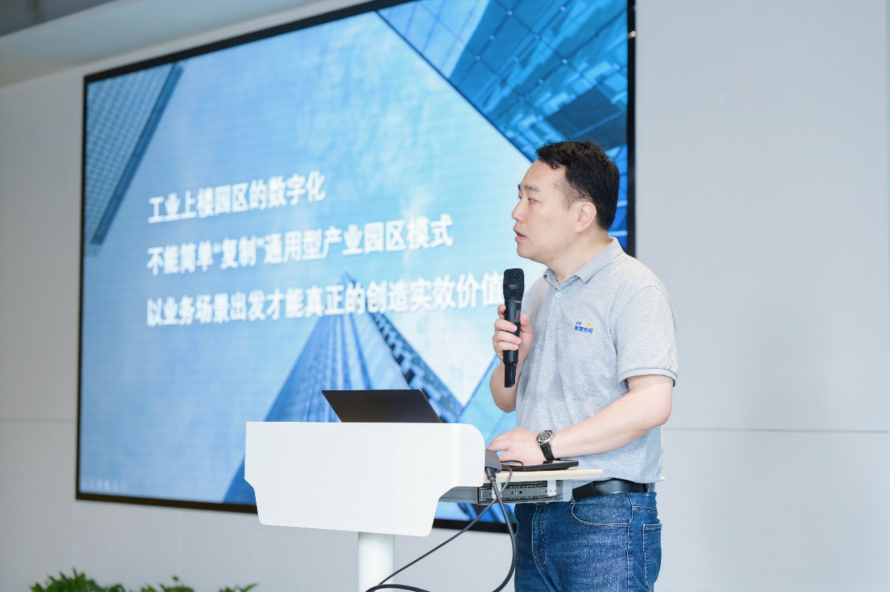 在高层大厦中进行企业的生产、办公、研发、设计的新型工业楼宇,与普通产业园区在数字化建设上有啥不同?在第一个环节的主题分享中,深圳市智慧空间平台技术开发有限公司助理总经理余乐先生做了相关介绍,余乐先生围绕工业上楼园区获客促去化、安全保生产、体验留人才、服务安企业、运维降成本五个实效价值场景出发的相关解决方案阐述。