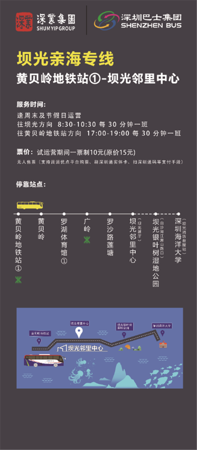 据悉,“坝光亲海专线”是在大鹏新区管委会的大力支持下,聚焦市区群众亲海休闲体验需求,由深业集团和深圳巴士集团联合推出的公交便民服务专线,将于6月22日端午节首发,实现深圳市中心区直达坝光片区巴士专线零的突破,有效解决市民节假日往返市区和坝光片区之间的出行需求。