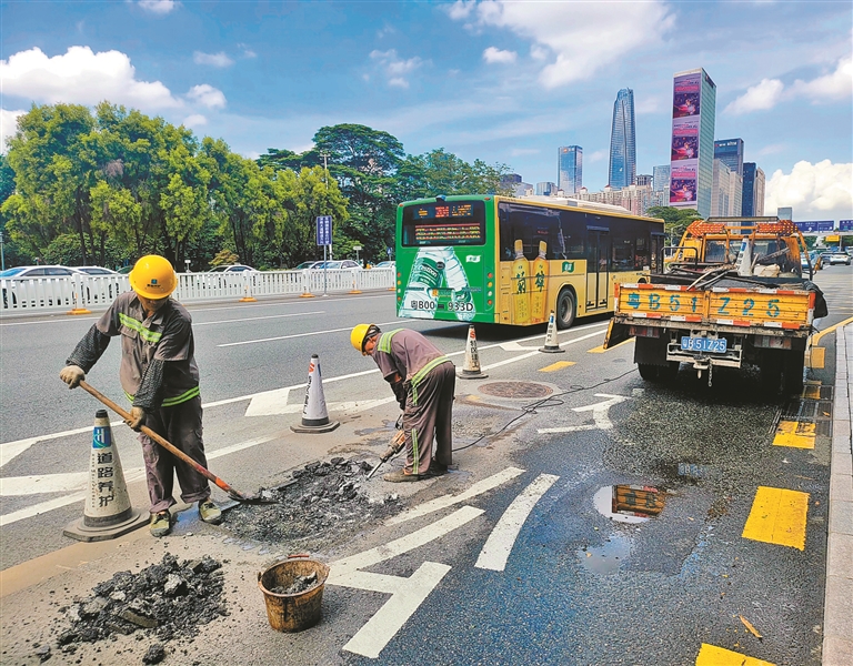 ▲工作人员正在修复破损道路。 深圳晚报记者 罗明 摄