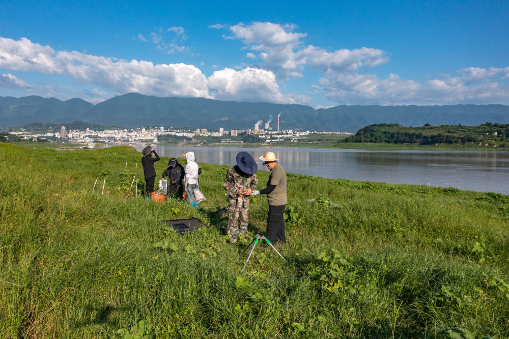 在位于重庆的中国科学院三峡库区水土保持与环境研究站,中国科学院成都山地所科研人员在库区消落带上开展相关监测(2023年7月5日摄,无人机照片)。新华社记者 黄伟 摄