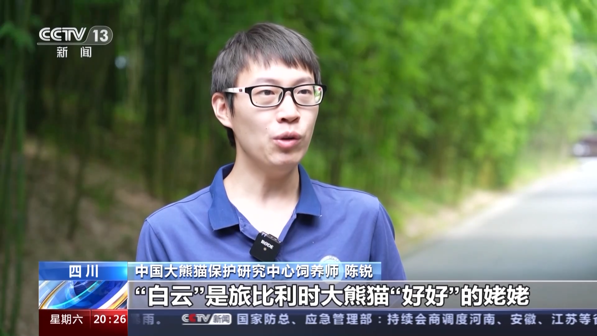 中国大熊猫保护研究中心饲养师 陈锐:“白云”32岁了,相当于人类约100岁,“希梦”也30岁了,都很健康。它俩还有个特殊身份,“白云”是旅比利时大熊猫“好好”的姥姥,“希梦”是旅比利时大熊猫“星徽”的姥爷。