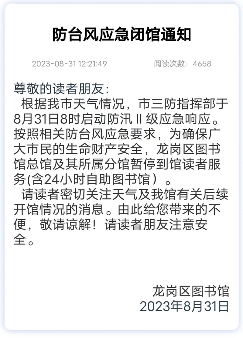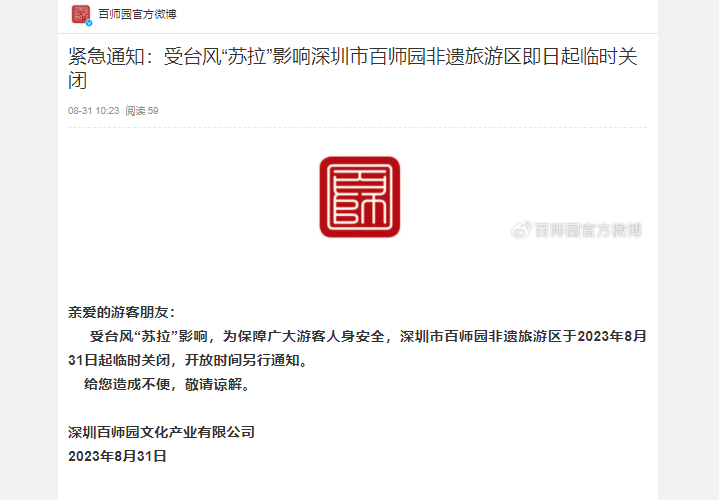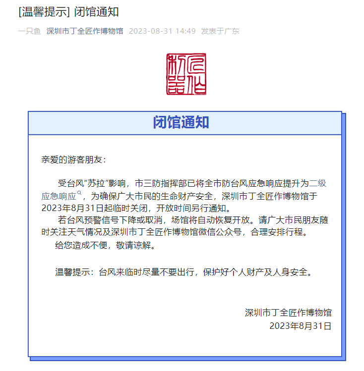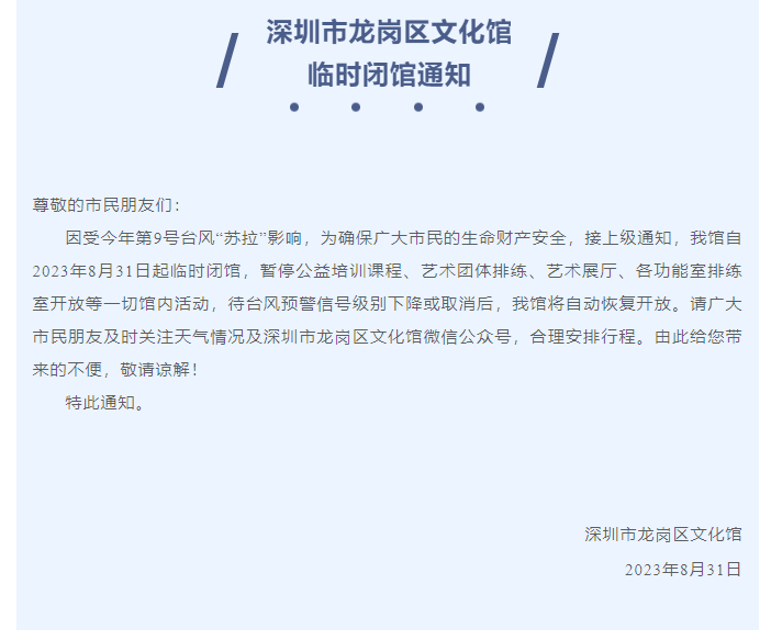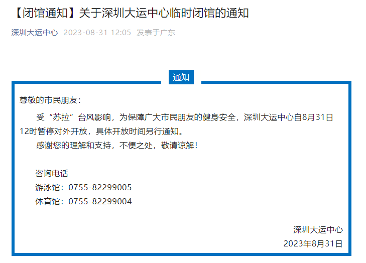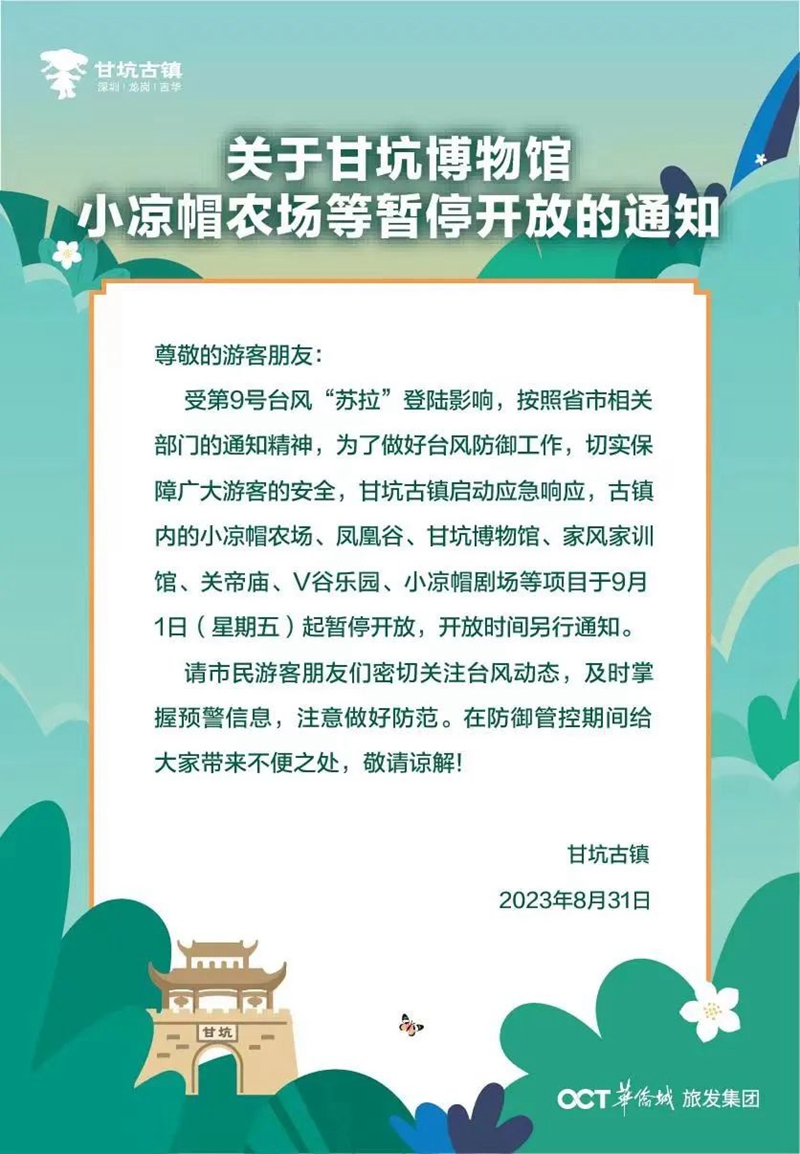深圳新闻网2023年9月1日讯(记者 李云云)深圳市气象台2023年09月01日06时00分将全市台风黄色预警信号升级为橙色。“苏拉”将正面袭击深圳市,或在深圳市100公里范围内移过。全市进入台风紧急防御状态。记者从龙岗区文化广电旅游体育局获悉,受台风影响,深圳大运中心、甘坑古镇、深圳市龙岗区文化馆、龙岗区各大博物馆等多个场馆、景点临时关闭。