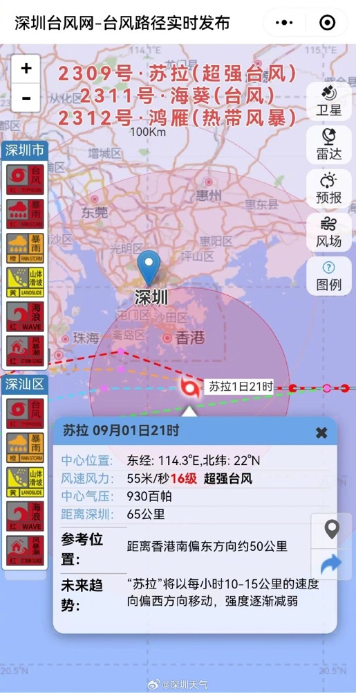 【深圳市分区暴雨橙色预警信号升级为红色】过去1小时大鹏新区、大鹏湾和大亚湾海区已出现暴雨,预计今天夜间仍有大暴雨。深圳市气象台2023年09月01日18时00分将上述区域暴雨橙色预警信号升级为红色。全市进入暴雨紧急防御状态,请迅速做好防御工作。