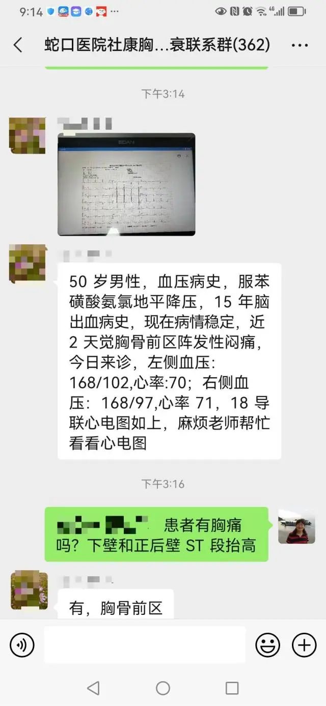据了解,患者梁先生,50岁,其既往有血压病、脑出血病史,因反复胸闷痛3天,加重4小时,于当日下午15:08就诊于南水社康。社康医生立即给其做心电图,并上传到社康与该院胸痛中心的联络群。
