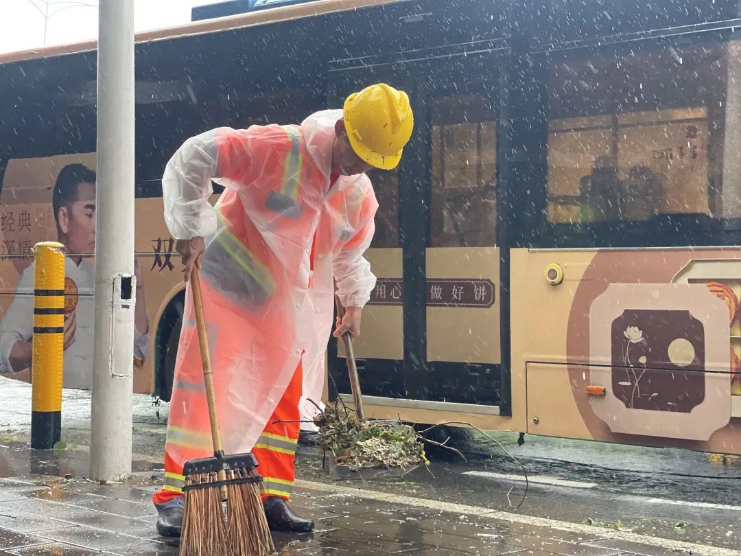 10点54分,记者在西乡奋达科技公交站台看到大部份公交车已恢复运营,站台已有不少市民正等候上车,环卫工人正冒雨清扫路面垃圾。(记者 谢莹)