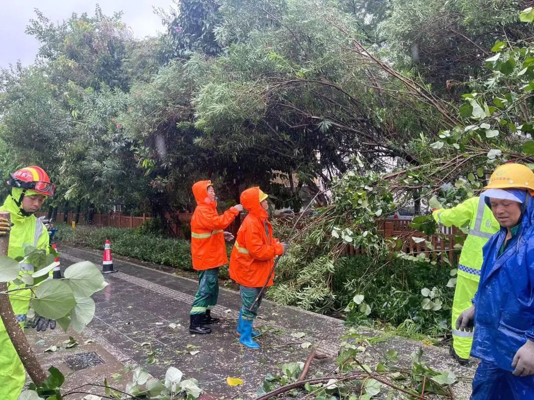 10点40分,宝安区宝安大道与航空路交汇处树木倒伏挡住通行路段,宝安区城管局、宝安区交通集团等多个应急部门迅速出动,清除倒伏树木,以便市民通行。(记者 谢莹)