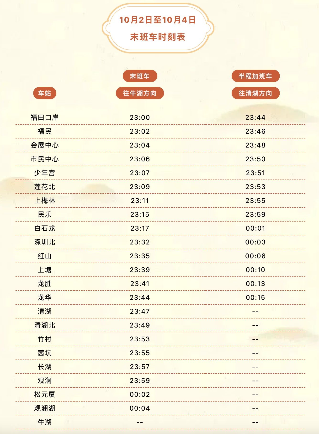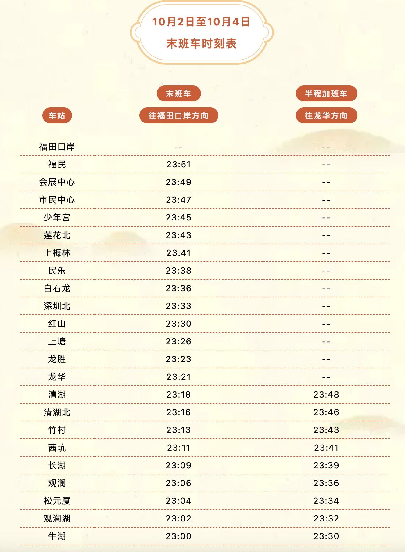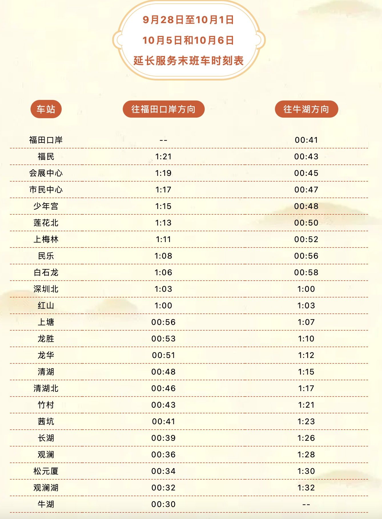 因中秋、国庆放假影响,预计福田口岸站、深圳北站、茜坑站、观澜站、牛湖站客流较大。