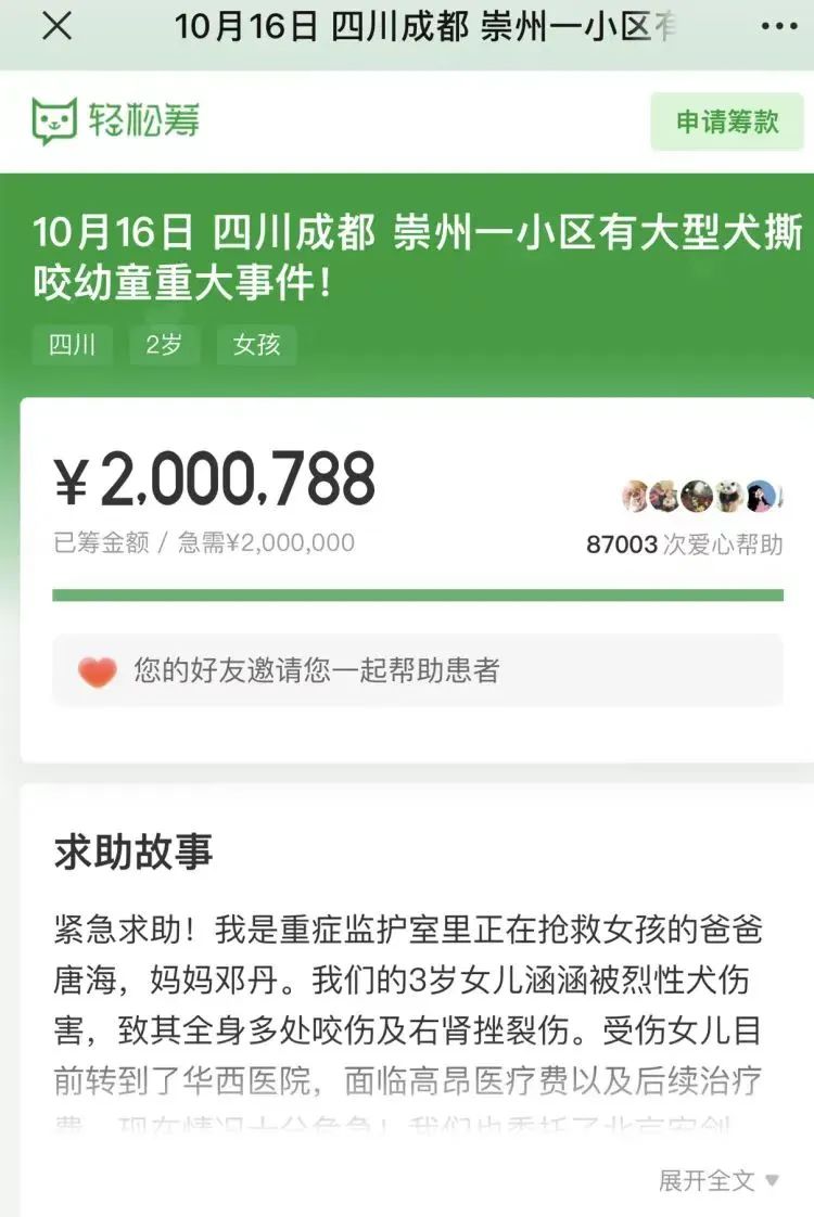 ● 10月18日13时许,被恶犬咬伤女童涵涵家属在轻松筹发起筹款。截至10月18日18时18分,捐款已达200万元筹款额。目前涵涵还在华西医院儿童ICU接受救治,仍处于昏迷状态。