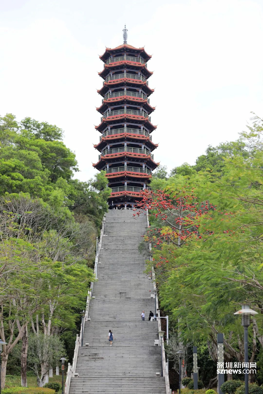 红花山公园最大的亮点就是山顶上那座9层塔。经过这一段1005级阶梯,可以到达公园的最高点——明和塔登高望远。当夜幕降临时,塔上灯火通明,瞬间就化身为一座琉璃宝塔,甚是壮观。除了能爬红花山,眺望公明,公园里还有大草坪、儿童乐园,既可以野餐又可以让孩子尽情玩乐。