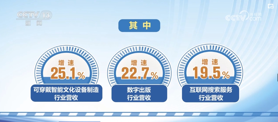 文化新业态行业规模持续壮大。前三季度,文化新业态特征较为明显的16个行业小类实现营收同比增长15.2%,占全部规上文化企业营收的比重超40%。其中,可穿戴智能文化设备制造、数字出版、互联网搜索服务等行业营收增速较快,分别为25.1%、22.7%和19.5%。