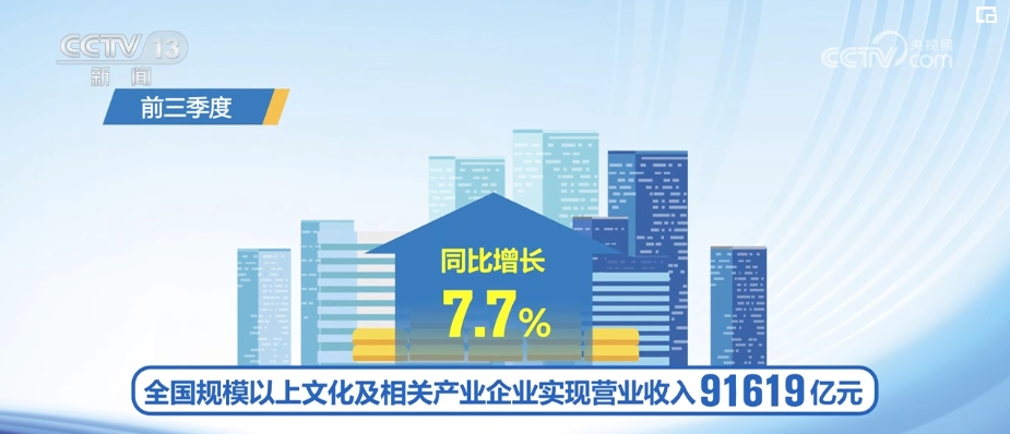 前三季度,全国规模以上文化及相关产业企业实现营业收入91619亿元,同比增长7.7%,增速比上半年有所加快。