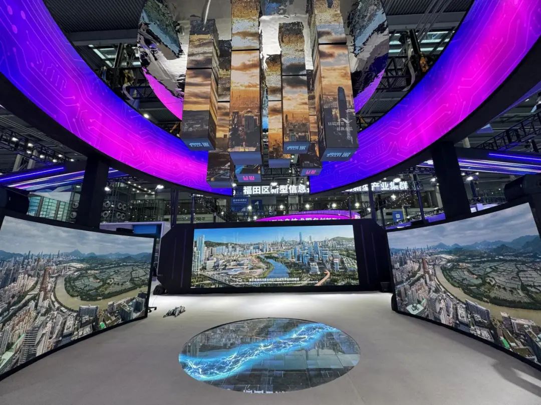中央区域利用多屏联动,以数字孪生河套整体规划沙盘为中心,两翼分别展示福田与河套的可交互全景规划图,地面的河套规划图与空中的福田CBD中心图景遥相呼应。