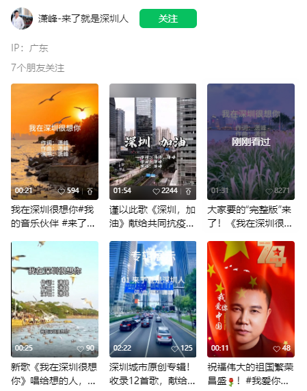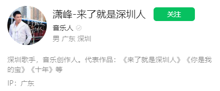 歌曲的发布者也是歌曲的原创视频号账户潇峰,根据视频号认证信息,这是一位深圳歌手,音乐创作人。其代表作是《来了就是深圳人》等。在其视频号主页,《我在深圳很想你》、《深圳加油》、《来了就是深圳人》都获得网友点赞热评。