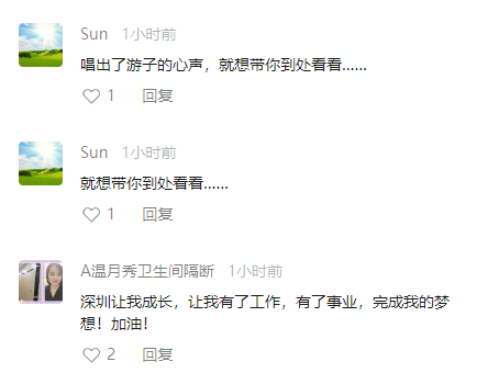 “从少女到妈妈,我10年里面的青春,都在这里”,“唱出了游子的心声,就想带你到处看看”、“深圳让我成长,让我有了工作,有了事业,完成我的梦想!加油!”