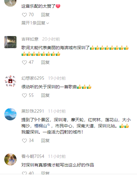 歌曲下面,网友评论最多的便是“美丽的深圳,美丽的海滨城市”。更有网友细数了歌曲中提到的景点,提到了9个景区,深圳湾,摩天轮,红树林,莲花山,大小梅沙,梧桐山,市民中心,深南大道,深圳北站。