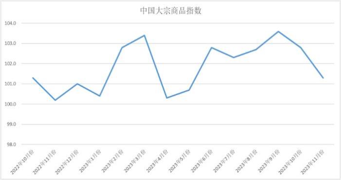 商品供应增速减缓。2023年11月份,大宗商品供应指数结束之前的连升,出现回调,当月较上月回落2.8个百分点,至101.1%,为近七个月最低点。