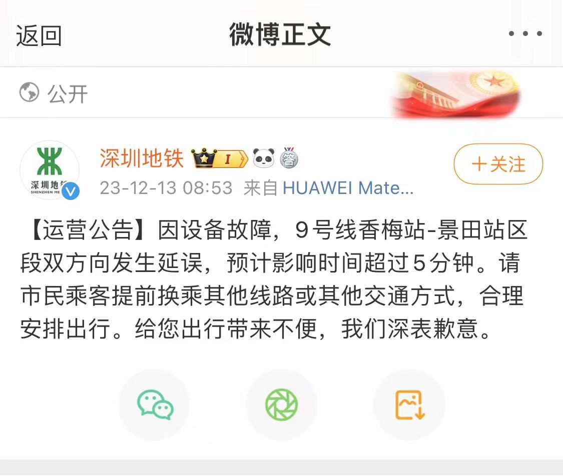 9点左右,@深圳地铁 官方发布公告,称因设备故障9号线香梅站至景田站区段双方向发生延误,预计影响超过5分钟。请市民乘客提前换乘其他线路或其他交通方式,合理安排出行。