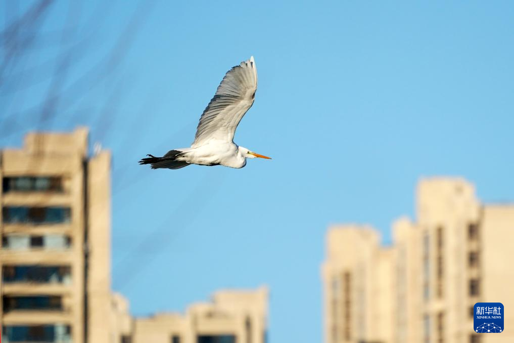 1月3日,在山西太原,白鹭在汾河上空飞翔。