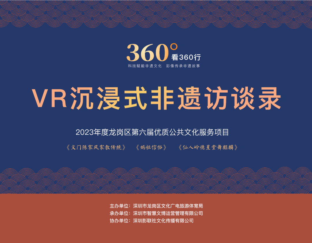 据悉,该节目已获评2023年度龙岗区第六届优质公共文化服务项目。此次展演活动采用了最新的VR技术,分别对国家级非遗《义门陈家训传统》、龙岗区非遗《妈祖信俗》和龙岗地方民俗《仙人岭德星堂舞麒麟》三个项目进行现场录制和沉浸式立体展演。同时,特别邀请深圳市公共文化促进会非遗与民间艺术专委会主任李元庆作为项目总顾问。