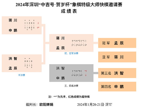 深圳新闻网2024年1月22日讯(记者 郭含笑)1月21日,2023年深圳“中吉号·贺岁杯”象棋特级大师快棋邀请赛在深圳罗湖梧桐山象棋馆鸣金收兵。冠亚军决赛中,孟辰凭借更为精彩且稳定的发挥,与蒋川鏖战七盘后捧得新年首冠。洪智在1月20日晚进行的季军战中击败申鹏,夺得季军。